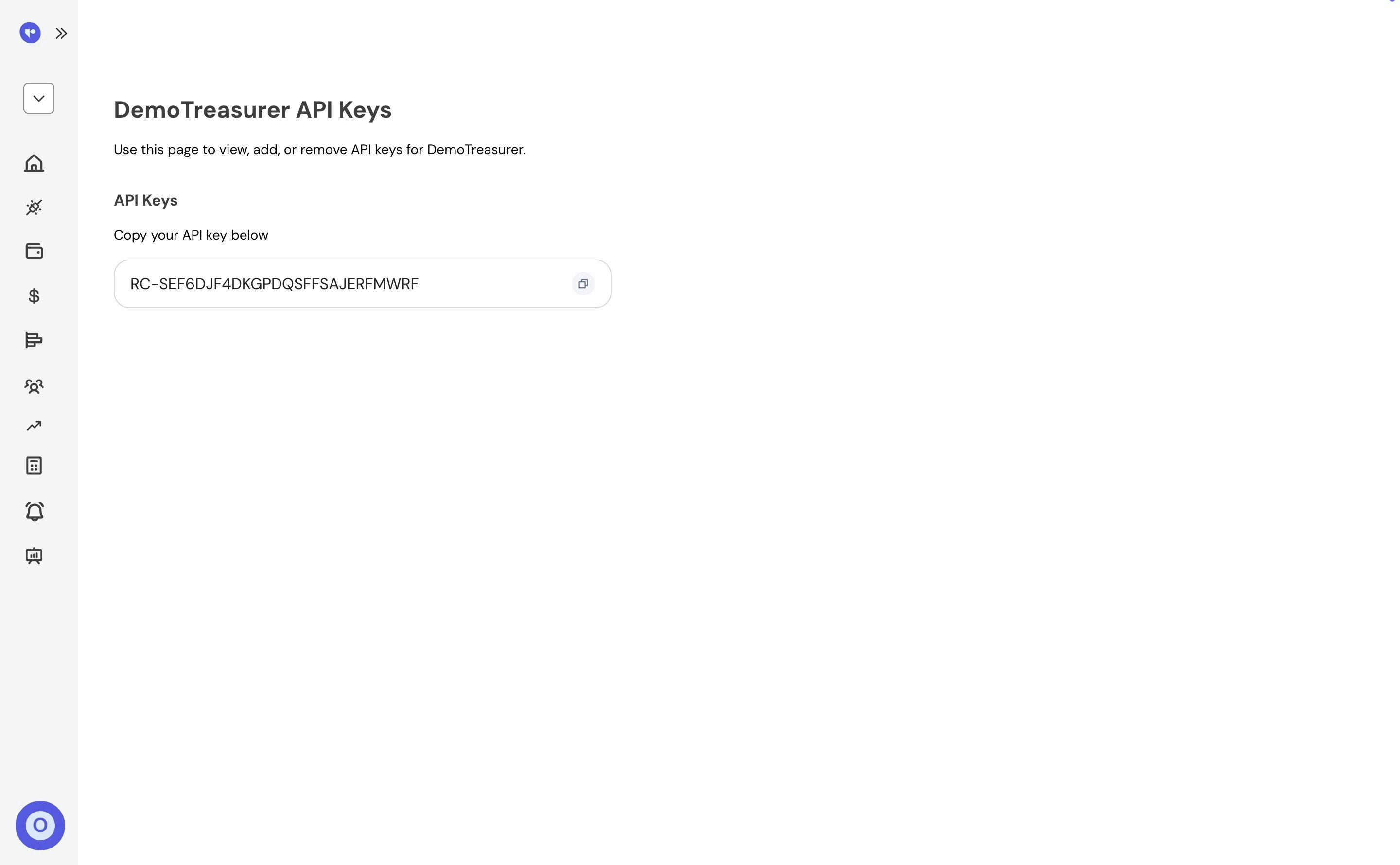 API keys can be created, viewed and managed in the Recital dashboard on the Settings > API keys screen.